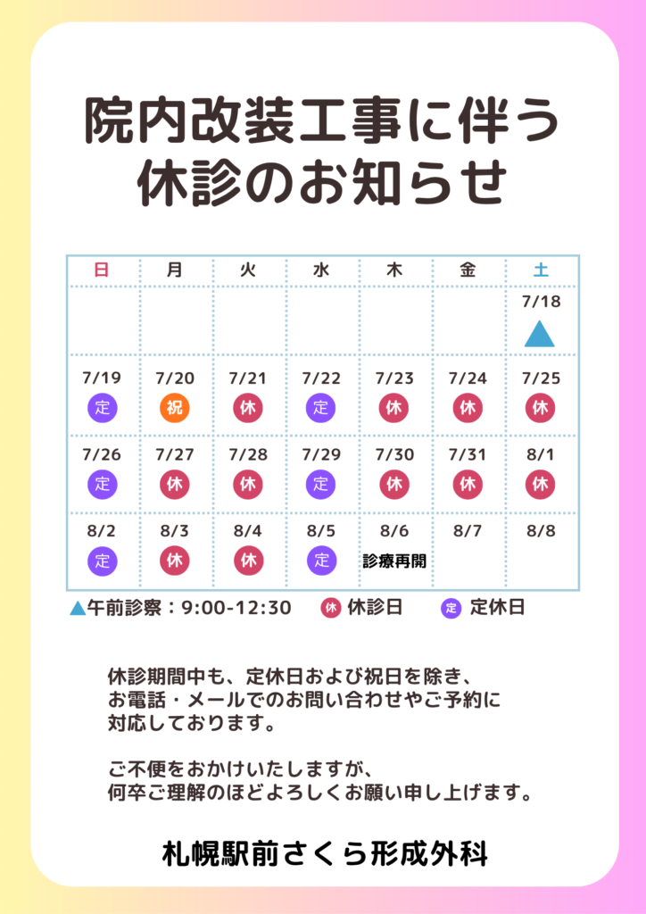 休診期間中も、定休日および祝日を除き、お電話・メールでのお問い合わせやご予約に対応しております。